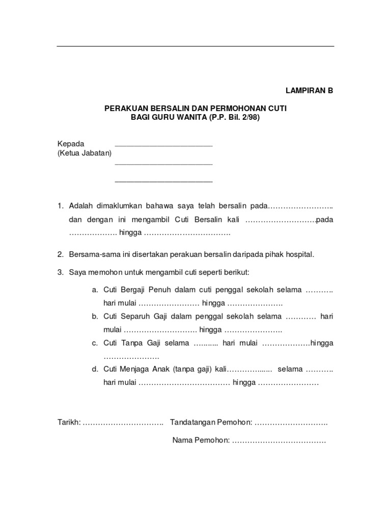 Lampiran A Borang Permohonan Cuti Bersalin Borang Permohonan Cuti Bersalin Pekeliling Perkhidmatan from demo.pdfslide.tips Pegawai telah menggunakan kemudahan cuti bersalin sebanyak 3 kali dengan setiap kali sebanyak 60 hari sehingga 31 ogos 2010. Lampiran a borang permohonan cuti bersalin (pekeliling perkhidmatan bilangan 14 tahun. Di sesetengah tempat, cuti bersalin boleh dikongsi oleh suami isteri. Jadi ketika isteri mendapat cuti bersalin, perlukah suami diberikan cuti 'paterniti'? Perakuan bersalin/surat dijangka bersalin hendaklah dilampirkan. 'best'lah kau, bulan depan dah nak mula cuti bersalin. Lampiran karya tulis jelas berbeda dengan lampiran dalam surat dinas atau surat resmi. Tempoh postpartum (selepas bersalin), merupakan satu tempoh paling rapuh bagi wanita, terutama bagi yang melalui proses kelahiran melalui pembedahan.