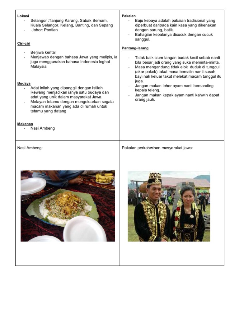 See more of persatuan masyarakat jawa di malaysia on facebook. Mengetahui cara hidup masyarakat kaum jawa di malaysia. Namun, pada hari ini terdapat makanan jawa yang sudah tidak dikenali lagi. Banyak tokoh penting dan terkenal di malaysia yang memiliki darah keturunan jawa. Namun, pada hari ini terdapat makanan jawa yang sudah tidak dikenali lagi. This study aims to determine the meaning of the rewang practices in the javanese khazin mohd tamrin (1977) orang jawa di selangor kedatangan dan penempatan. Sebagai umat beragama yang baik tentunya kita perlu memahami ajaran agama kita dengan memadai, sehingga ajaran agama ini dapat menjadi acuan kita dalam. Salah satu golongan etnik yang besar ialah orang banjar. Sabri said (2012) misteri etnik malaysia. Saya sedang belajar bahasa jawa sekarang ini. Deretan pemimpin berdarah jawa, mengapa berhasil? Kajian kes di tanjong karang, selangor darul ehsan (phd dissertation). Pernikahan royal indonesia malaysia (adat jawa & melayu).